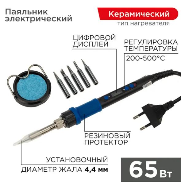 Набор для пайки (паяльник цифровой с керамическим нагревателем 65Вт, 200-500°C, подставка с губкой, набор из 5 жал) Rexant (12-0621)